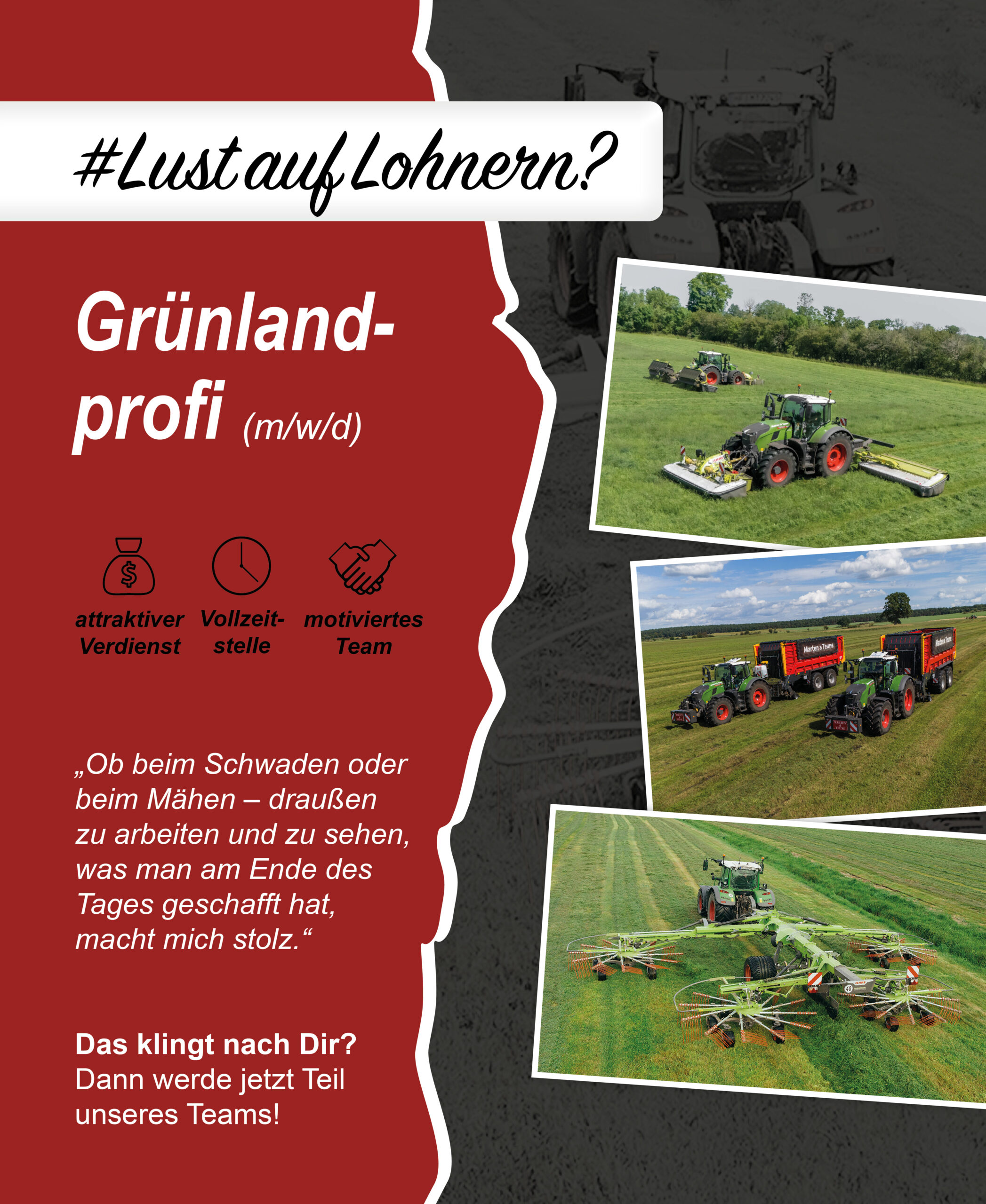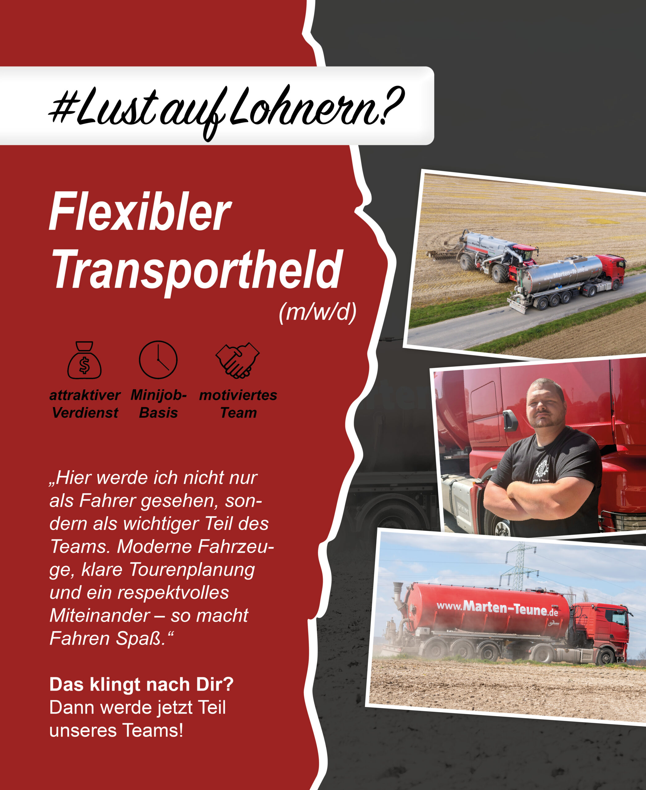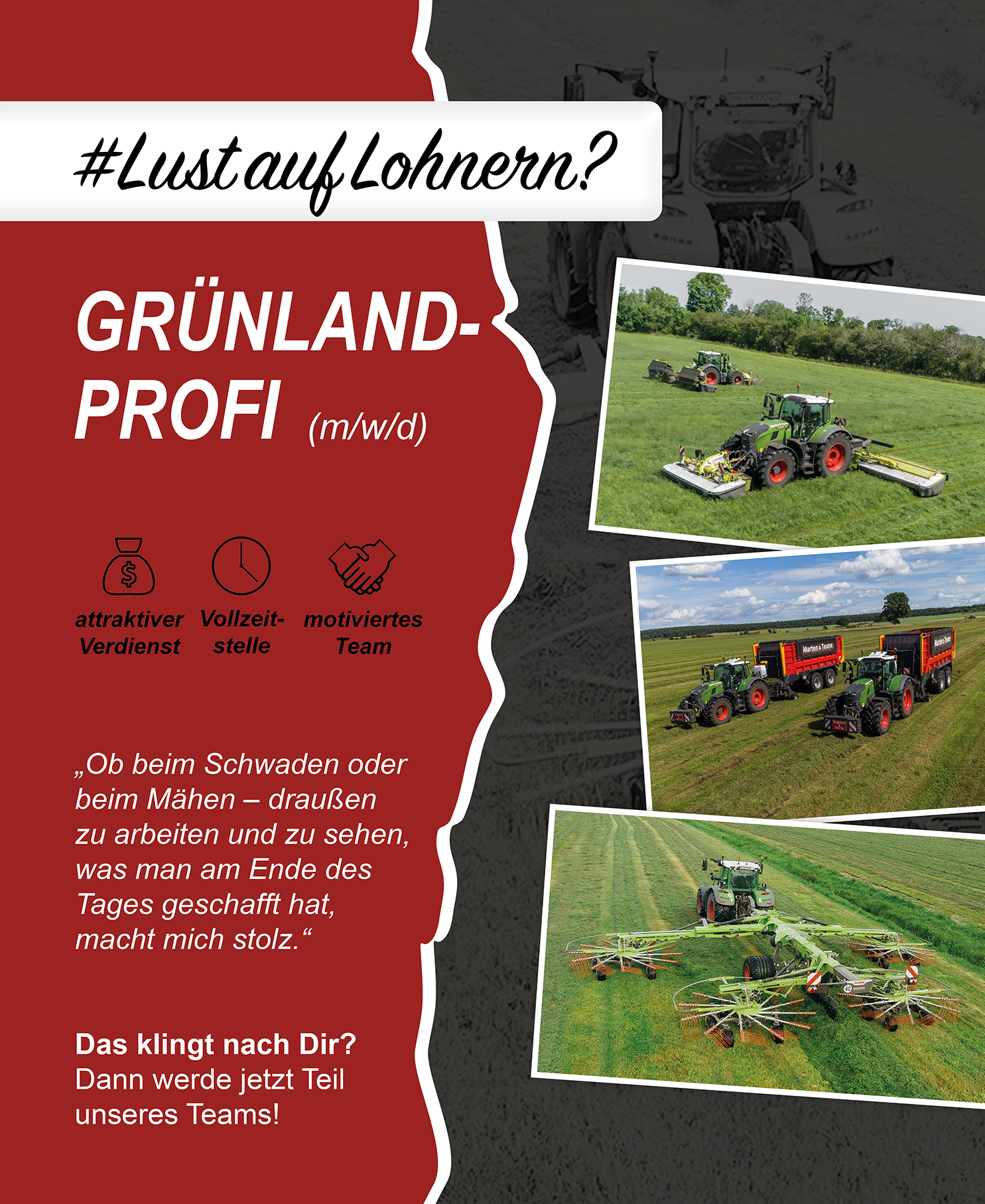 Ich gehe morgens gerne zur Arbeit und hab richtig Bock! Bei Marten & Teune kann man Beruf und Familie vereinbaren, was gerade bei einem Lohnunternehmen nicht immer gegeben ist. Ich bin seit vier Jahren hier und habe auch einen eigenen Betrieb zuhause, auch hier bekomme ich die Freiheit, das miteinander zu kombinieren.
